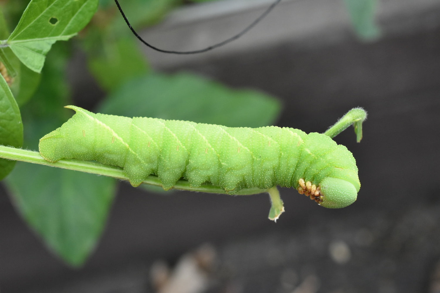 トビイロスズメは大型のスズメガの仲間で、日本各地に生息する在来種です。幼虫は鮮やかな緑色をした大きなイモムシです